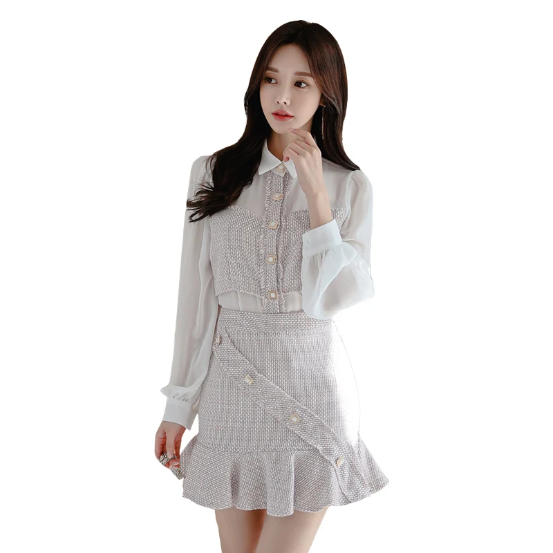Images of Two Piece Set Puff Sleeve White Shirts And Mini Skirt Matching Sets Women Office Chiffon Woolen Patchwork Single Breasted Shirt :