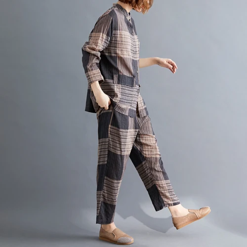 Images of 2019 Autumn New Popular Wind Single Breasted Designs Female Simple Comfortable Loose Leisure Women Cotton Hemp Two Piece Clothes :