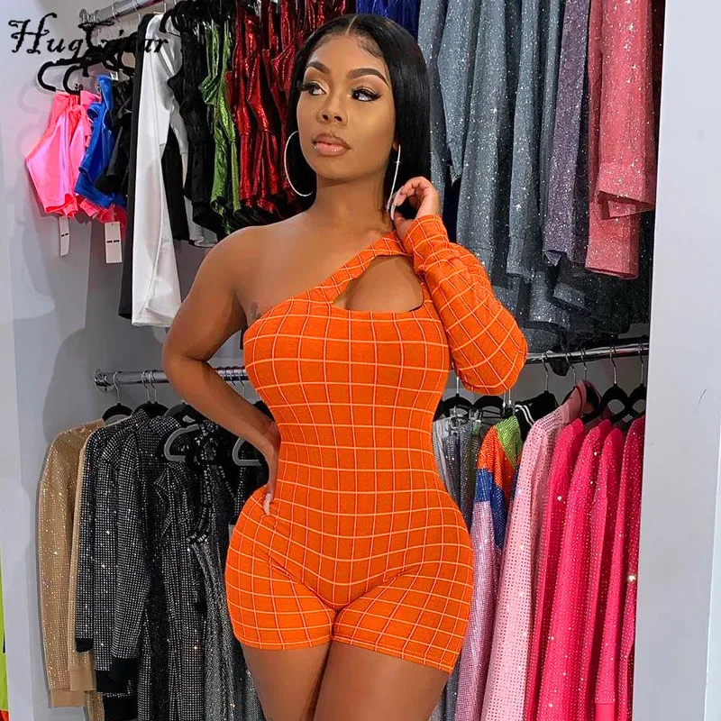 Images of Hugcitar 2019 long sleeve one-shoulder sexy bodycon playsuit autumn winter women plaid body club sporty body :