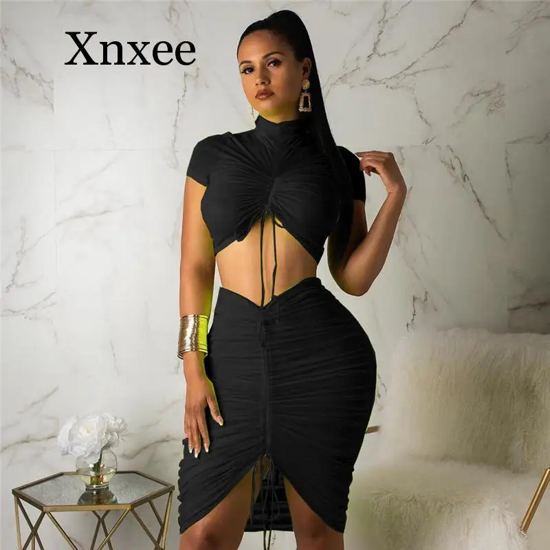 Images of 2020 dancing Neck Neon Pleated Crop Top Skirt Sets Women Party Casual 2 Piece Set Short Sleeve Tee & Tube Skirt Matching Sets :