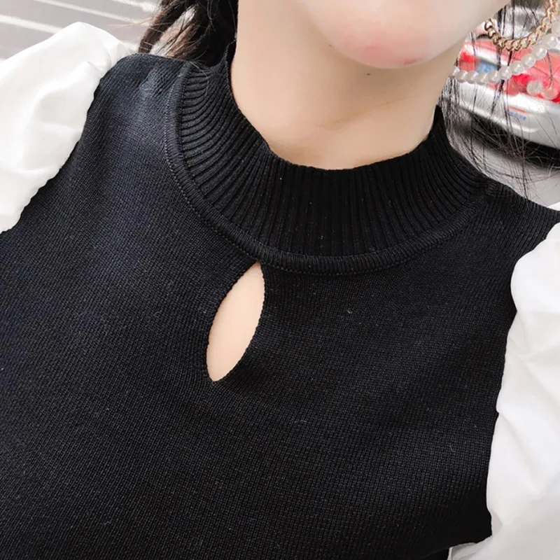 Images of Fashion Stitching Femme Knitted Top Sweaters Women Loose V Neck Sweater Long Sleeve Lantern Sleeve Pullover :